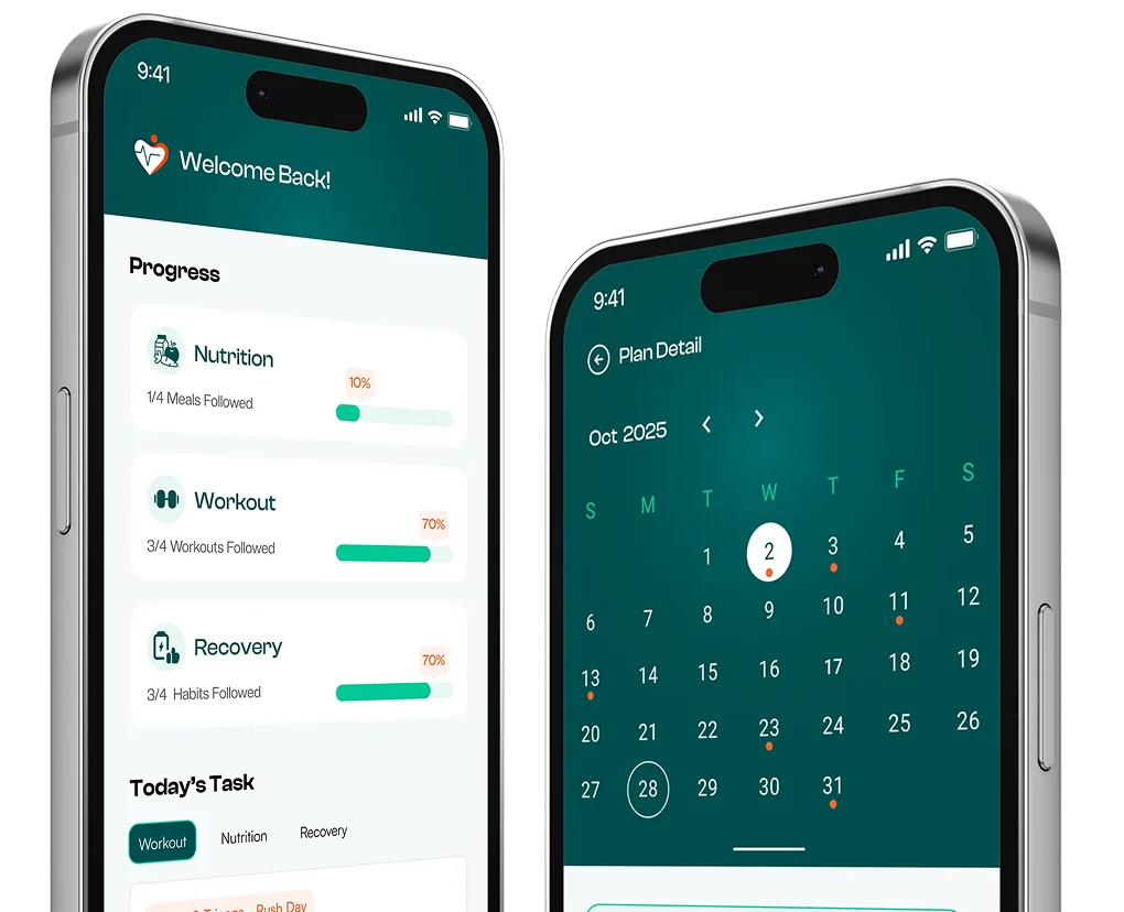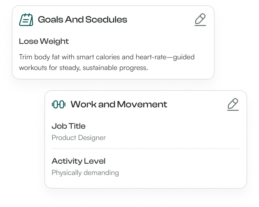 Your AI coach creates a structured plan based on your fitness goals, activity level, work schedule, and lifestyle, evolving as you progress.